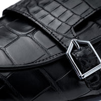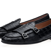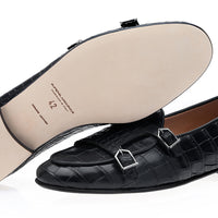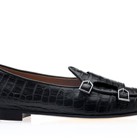 Step into timeless elegance with our black double-monk Belgian loafers, crafted entirely from genuine Mississippiensis crocodile leather. The deep black hue and distinctive texture of the exotic leather, accentuated by refined calfskin piping and sleek nickel-finished metal buckles, create a sophisticated statement of exclusivity and impeccable style.