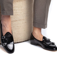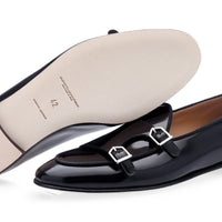 Handcrafted Black Polished Calfskin Double-Monk Belgian Loafers with Silver Buckles