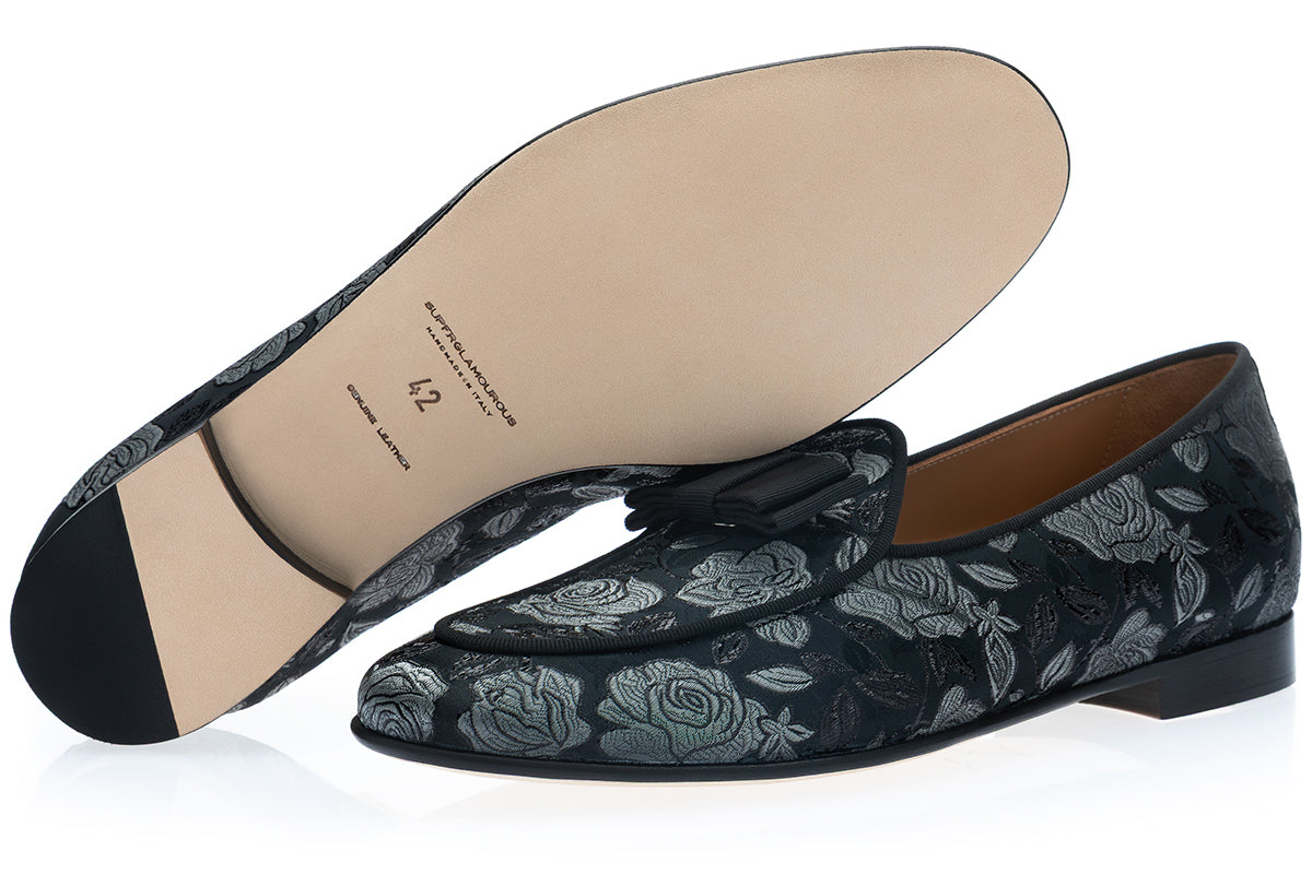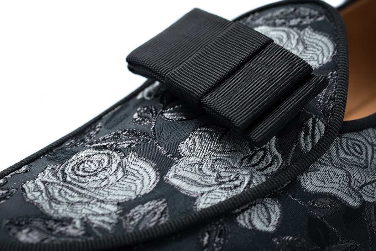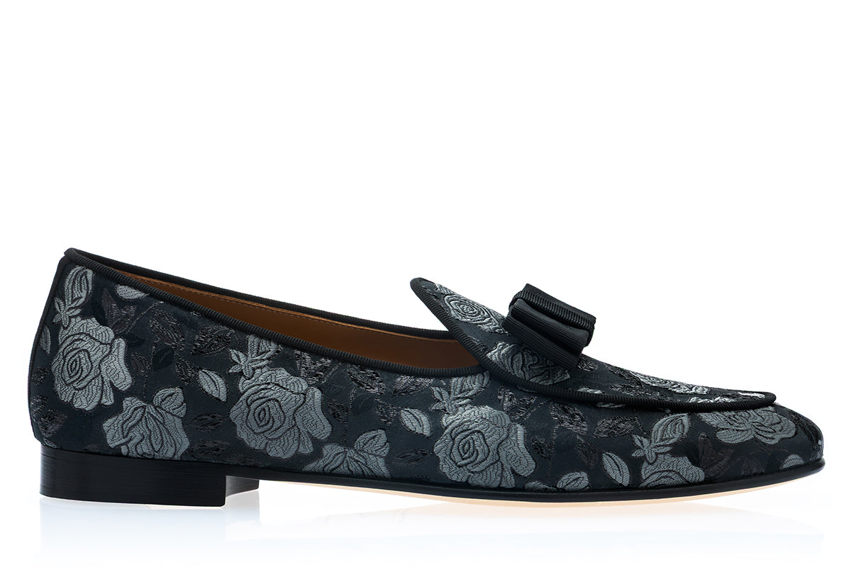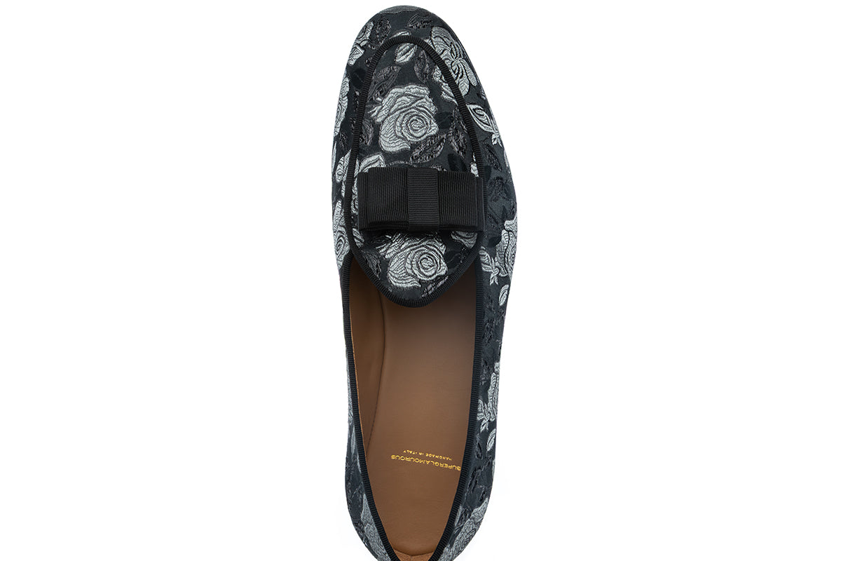 Elegant, distinctive, and richly textured, these Belgian loafers reinterpret classic evening footwear through the opulence of decorative textile tradition. The upper is crafted from a dark-toned multicolor jacquard canvas featuring an intricate floral pattern, where luminous silver roses emerge against a deep black background. The interplay between the matte and slightly reflective threads creates a refined sense of movement and depth, echoing the luxurious surfaces of historic decorative fabrics. Inspired by the ornate brocade tapestries of the 18th-century Rococò period, the design evokes a sense of aristocratic elegance while remaining strikingly modern. Grosgrain piping outlines the elongated silhouette with precise tailoring, while the signature grosgrain bow on the vamp adds a subtle yet unmistakable sartorial detail.