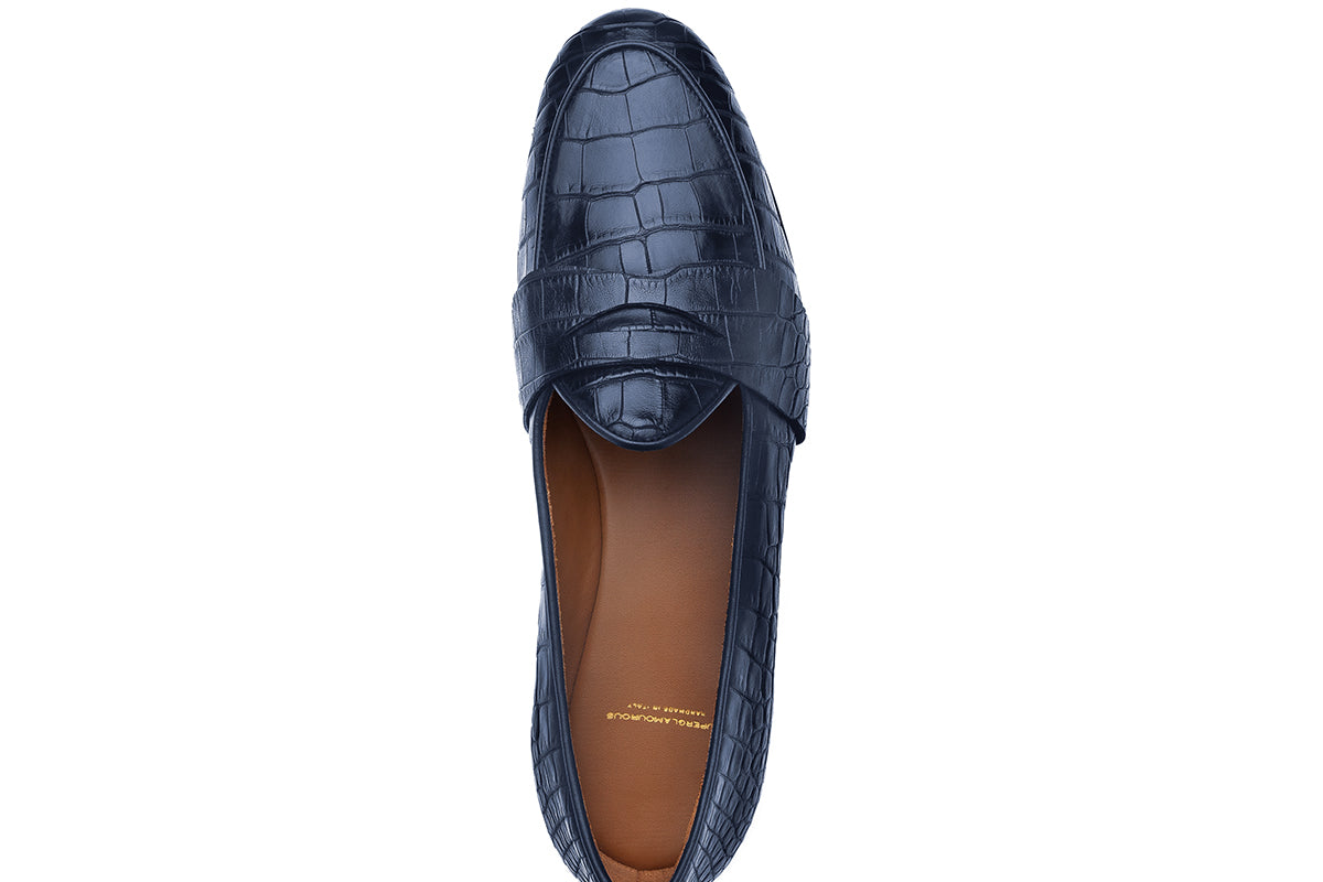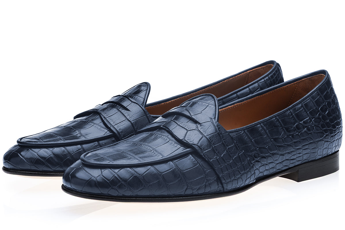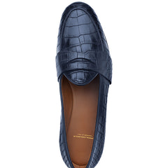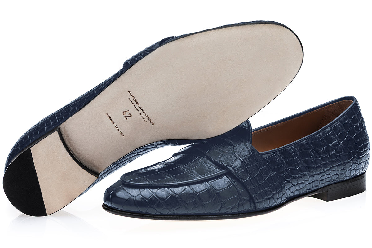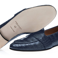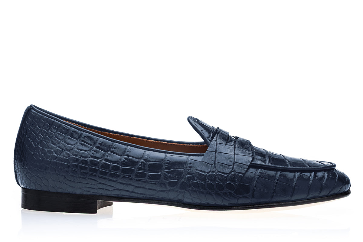 With their impeccable craftsmanship and understated elegance, these navy blue crocodile Belgian loafers redefine modern luxury, catering to those who demand the finest in footwear.