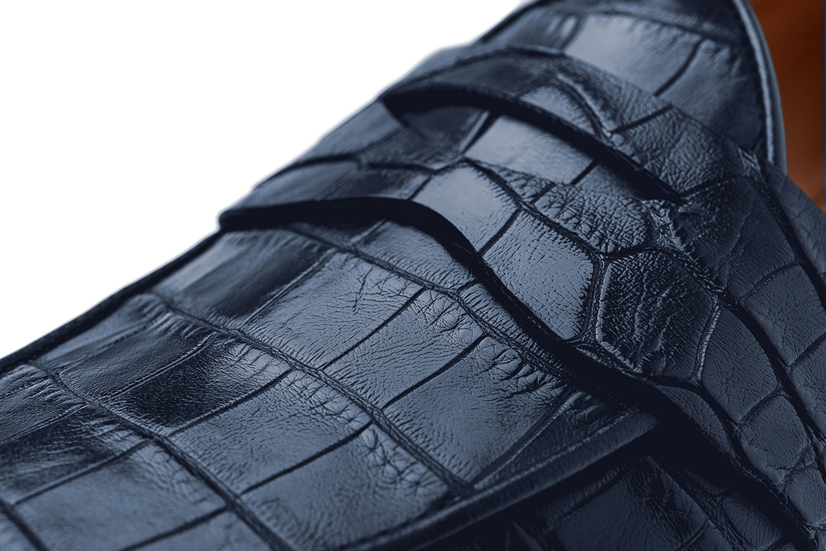 Experience the pinnacle of luxury with our navy blue Belgian loafers, crafted entirely from genuine Mississippiensis crocodile leather. The deep, sophisticated navy hue and rich texture of the exotic leather create a striking yet timeless aesthetic, embodying refined elegance and exclusivity for the modern gentleman.