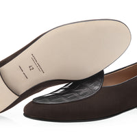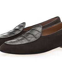 Handcrafted Dark Brown Suede Belgian Loafers with Genuine Crocodile Inserts