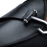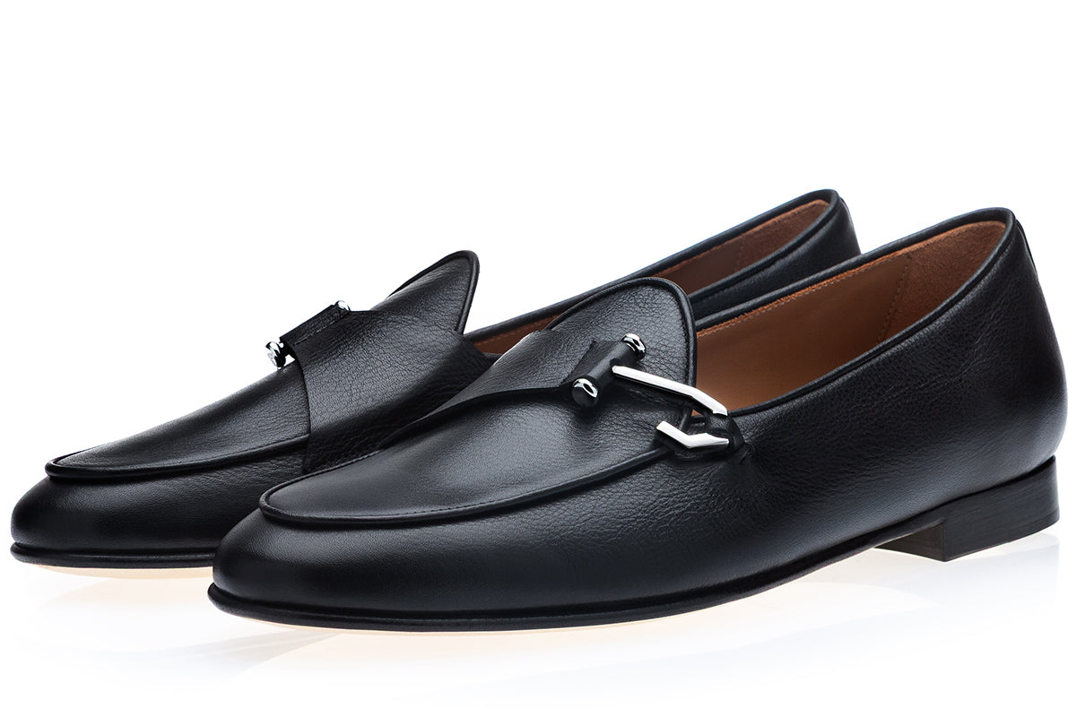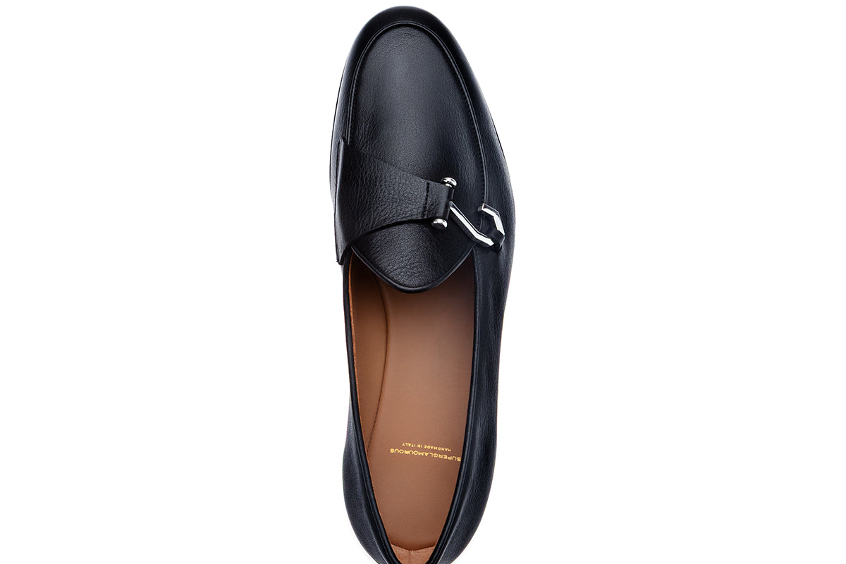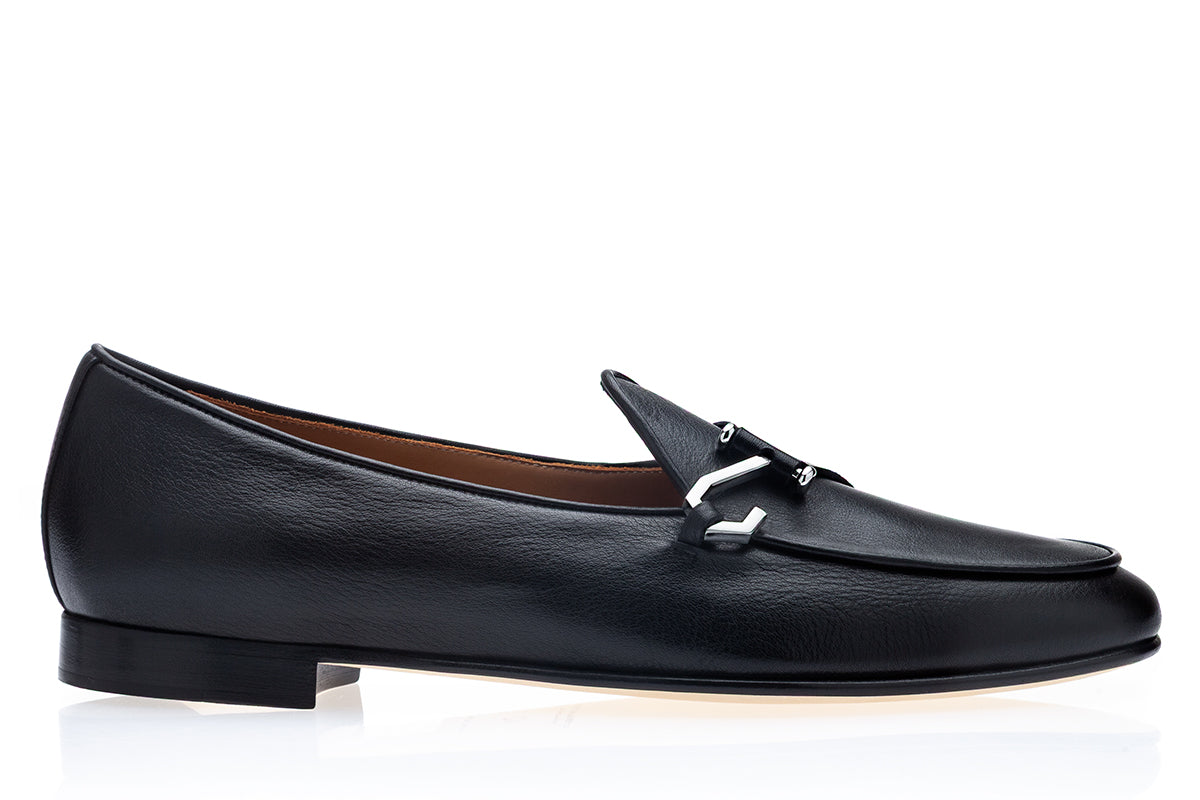 Modern sophistication meets artisanal heritage in our black supple calfskin Belgian loafers — a distinctive reinterpretation of the Tangerine 12 silhouette. Crafted from luxuriously soft Italian calfskin, this single-monk design introduces a bold new icon for the brand, featuring a sculptural square metal hook in a refined silver finish.