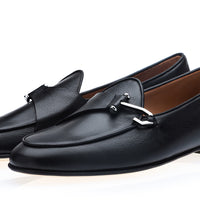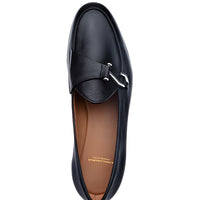 Handcrafted Black Supple Calfskin Single-Monk Belgian Loafers with Silver-Finish Metal Hook