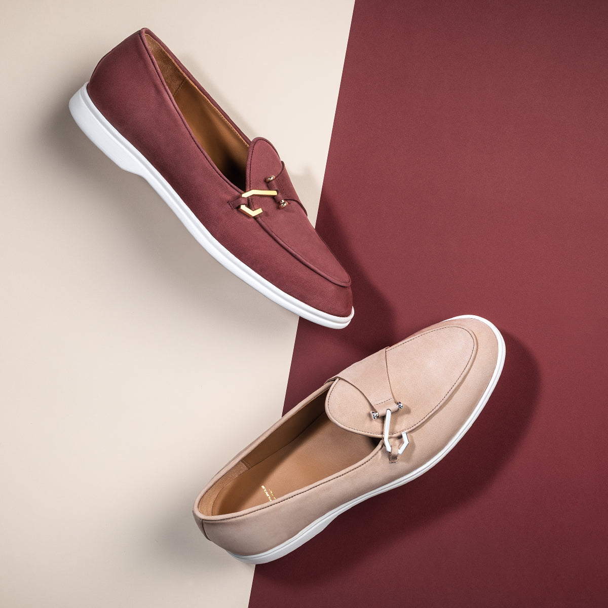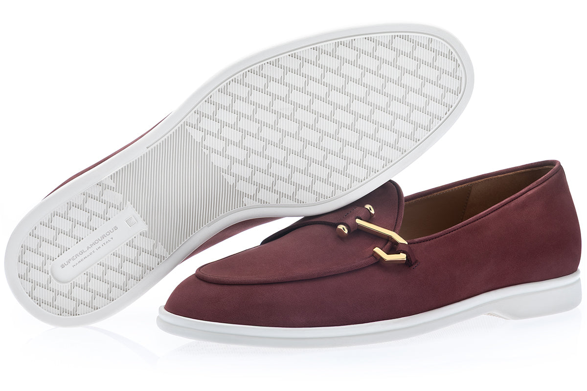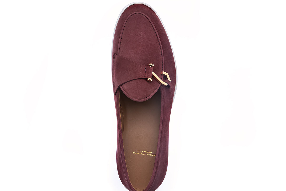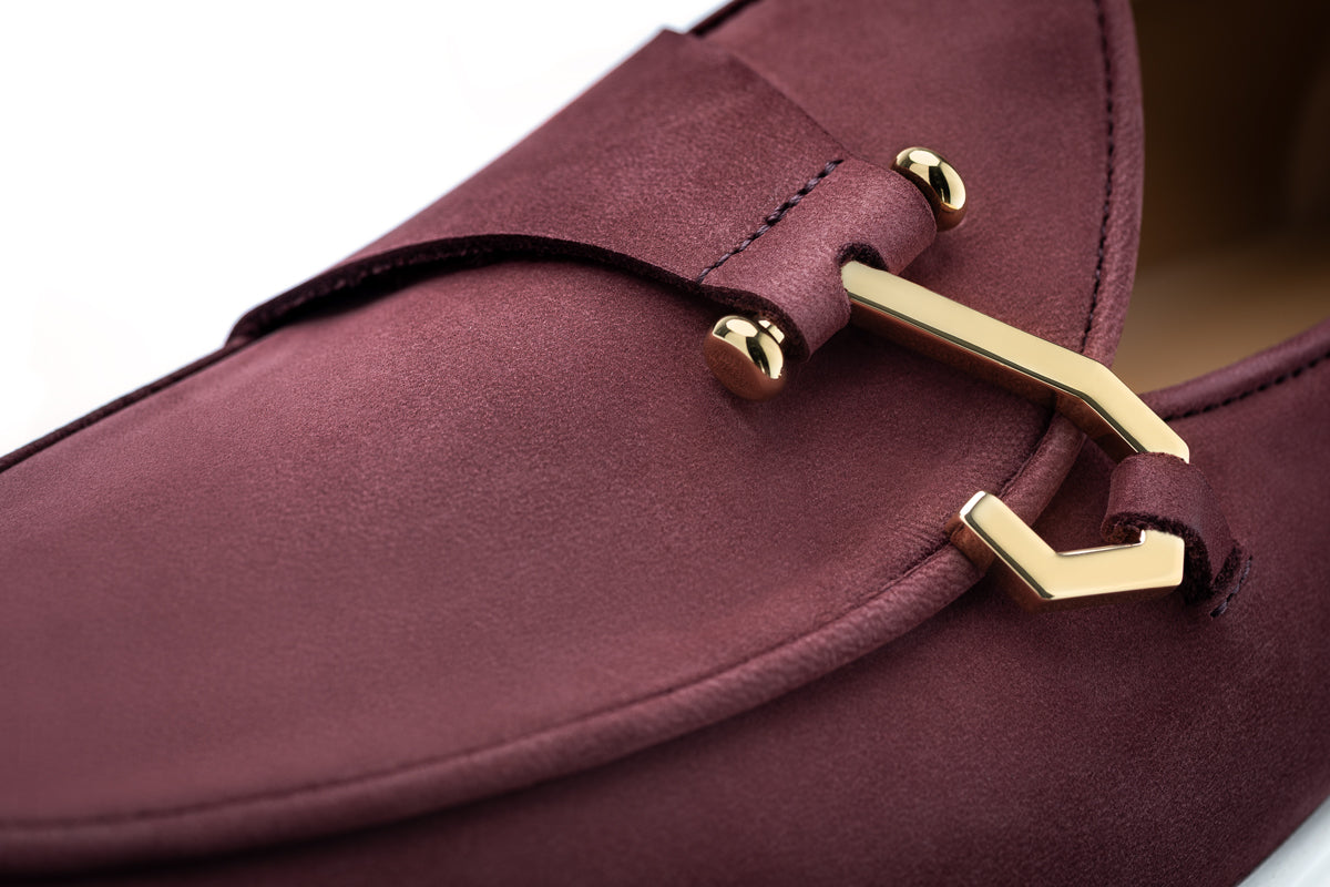 Rich in tone and contemporary in spirit, our bordeaux nubuck Belgian-style slip-on is a refined evolution of casual sophistication. Crafted from soft Italian nubuck with a velvety hand and finished with tone-on-tone piping, the design is elevated by a sculptural gold-finish metal accent — bold yet impeccably elegant.