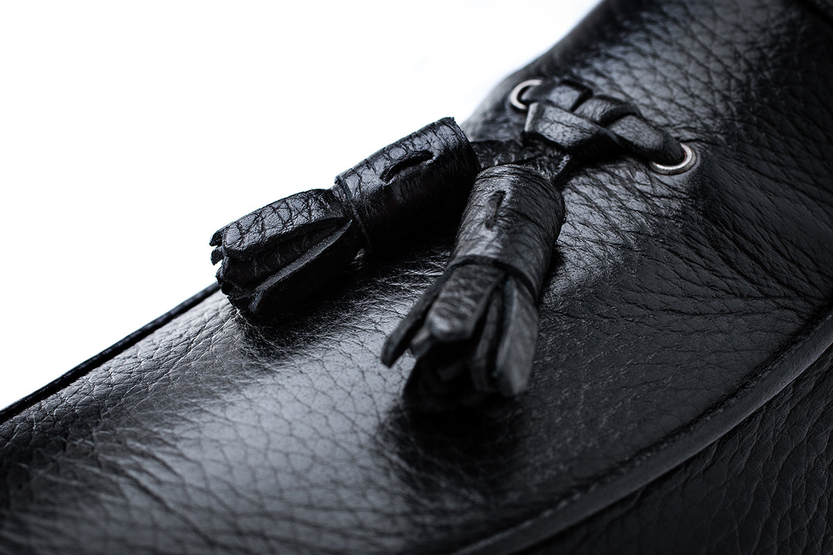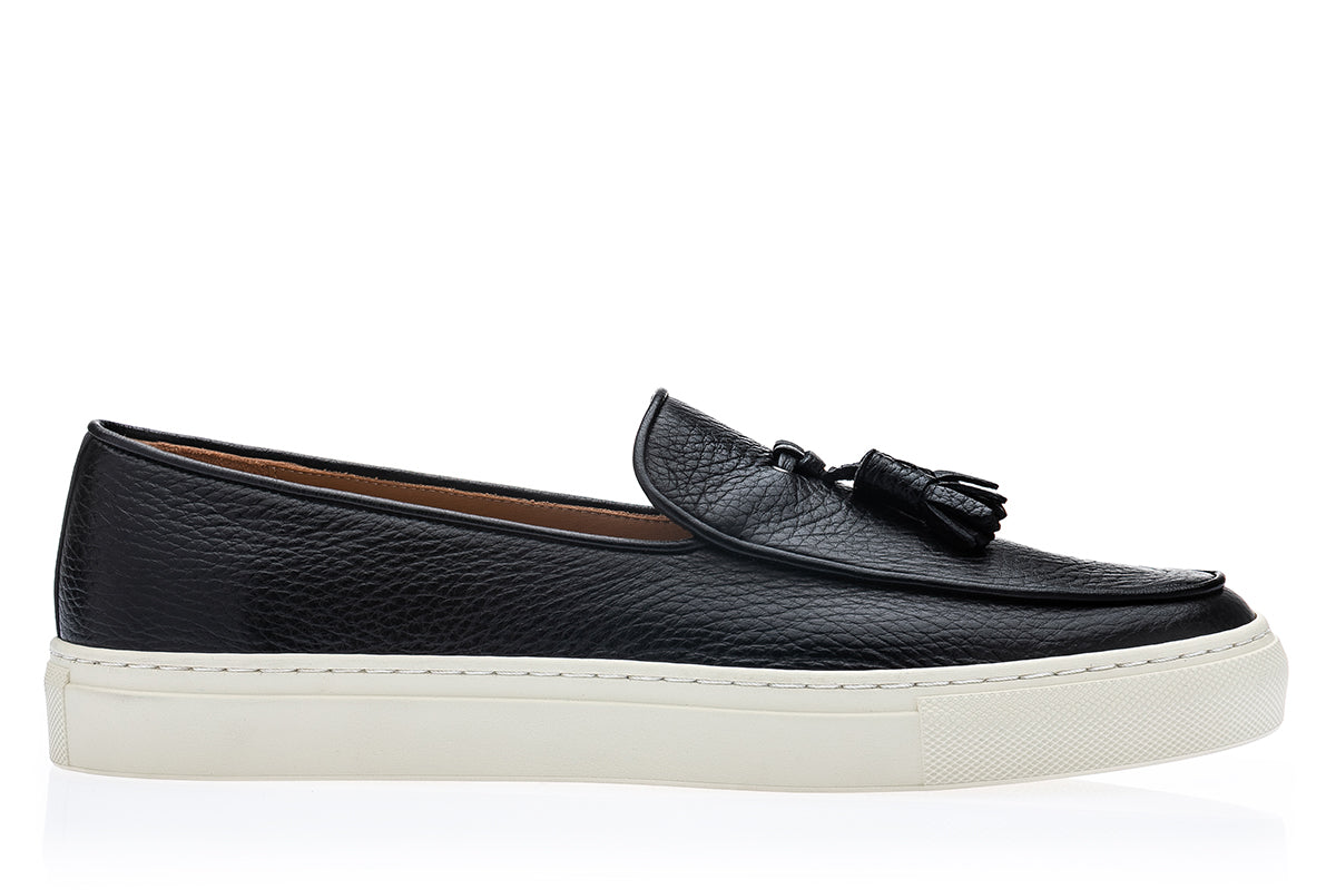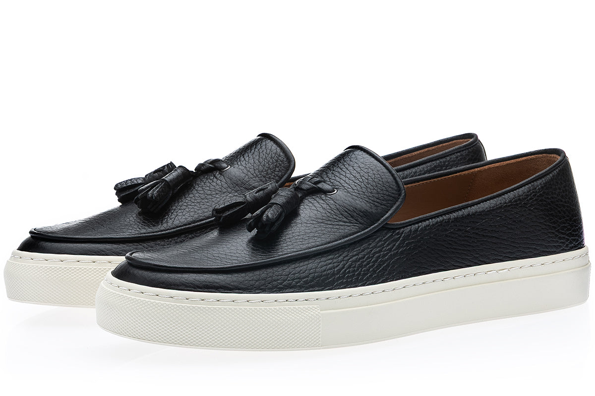 A modern expression of laid-back refinement, these black genuine deerskin slip-on sneakers reimagine the classic Belgian silhouette through a contemporary lens. The naturally grained and supple texture of premium Italian deerskin is paired with matching tassels and tonal piping, striking a perfect balance between relaxed ease and timeless sophistication.