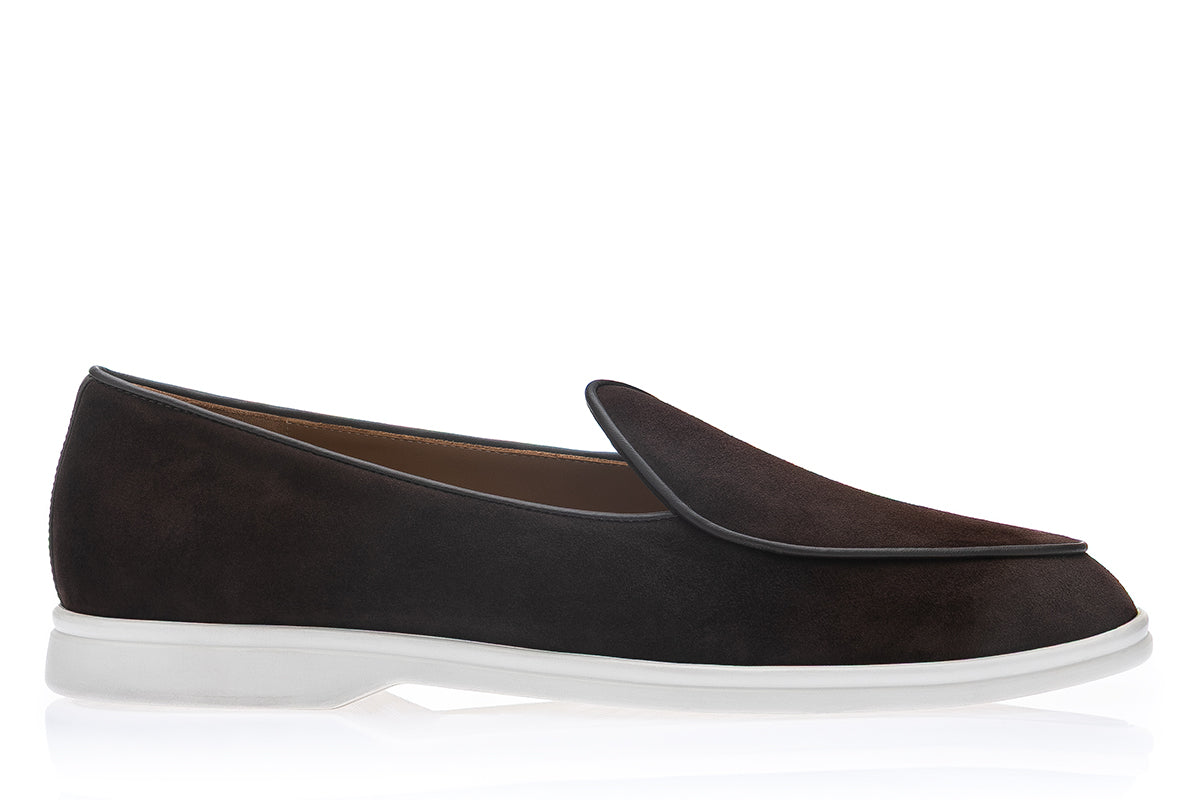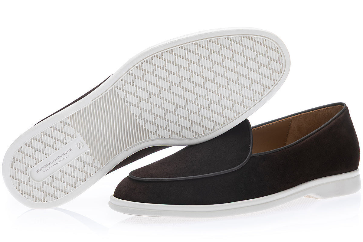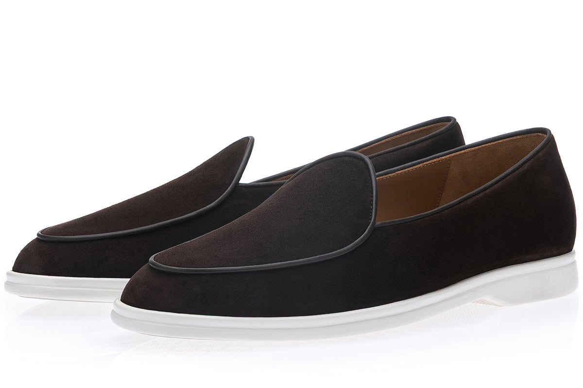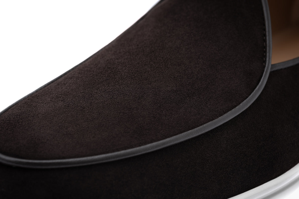 Handcrafted Dark Brown Suede Belgian-Style Slip-On with Calfskin Piping and Seamless Margom® Soles