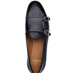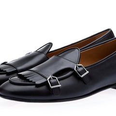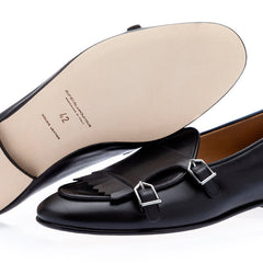 Black hand-brushed calfskin double-monk Belgian loafers with matching piping, fringed inserts and metal buckles in silver finish.