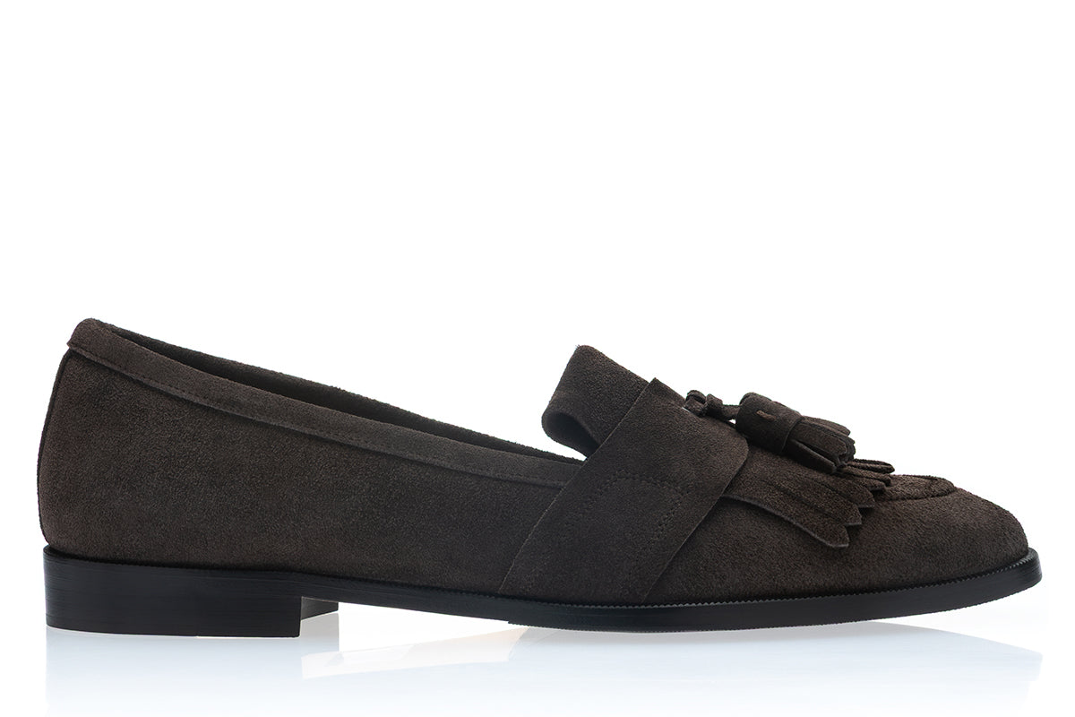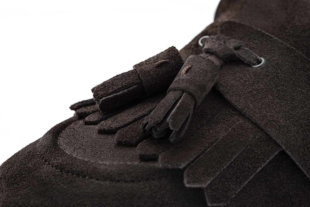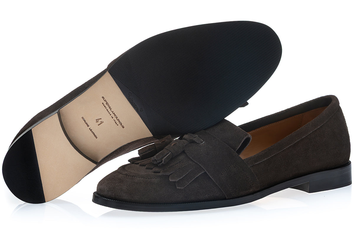 Handcrafted Dark Brown Waterproof Suede Loafers with Matching Bands, Fringes and Tassels