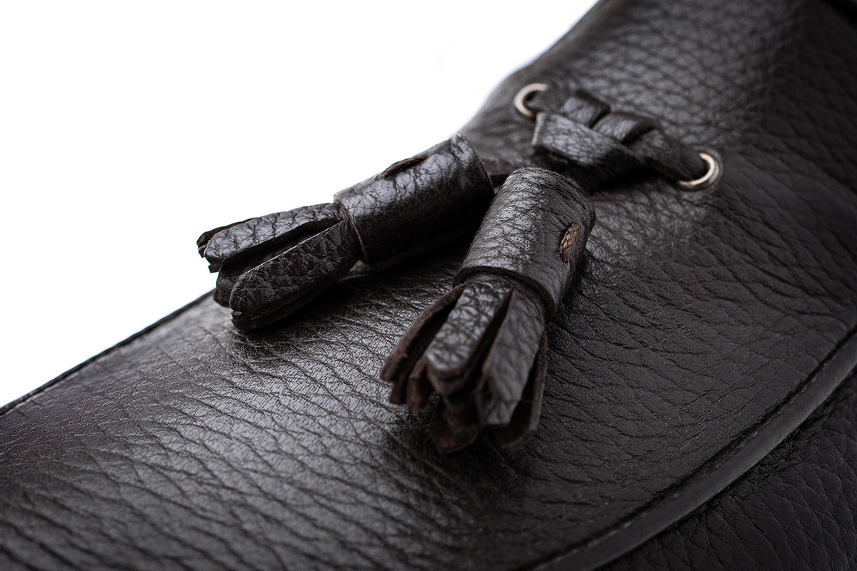 A contemporary take on casual sophistication, these dark brown genuine deerskin slip-on sneakers reinterpret the classic Belgian silhouette with natural elegance. The rich, supple texture of premium Italian deerskin is enhanced by matching tassels and tonal piping, offering a refined aesthetic rooted in comfort and understated detail.