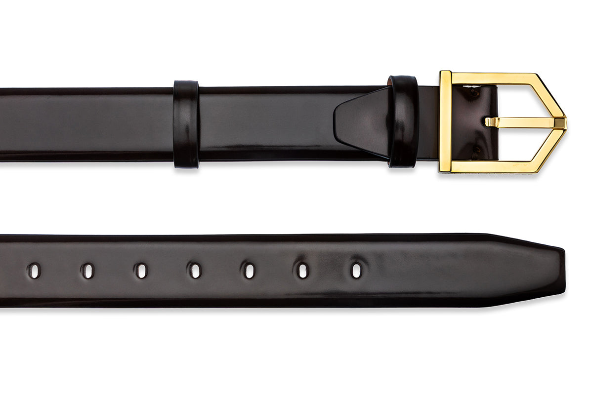 Dark brown hand-polished calfskin 35 millimeters belt with golden solid brass buckle.