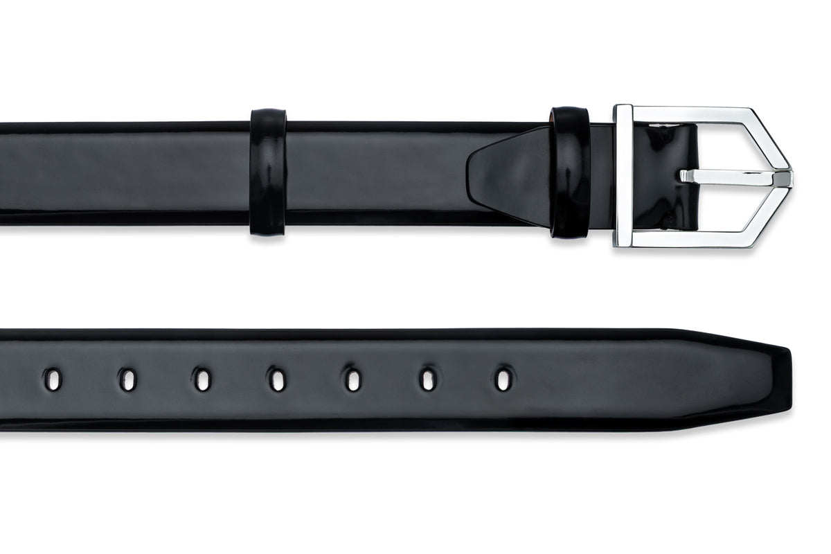 Black hand-polished calfskin 35 millimeters belt with solid brass buckle in silver finish.