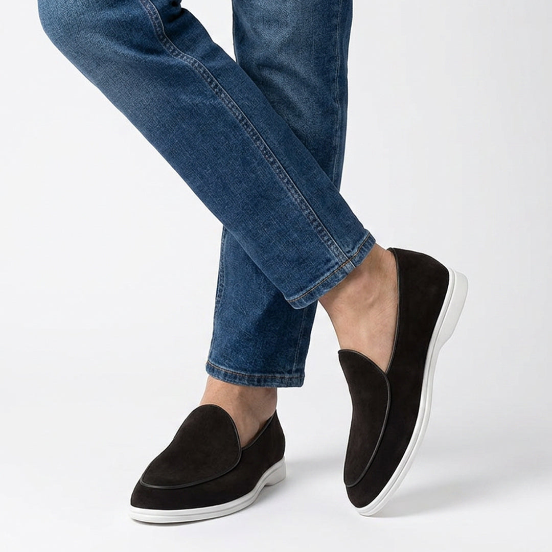 Handcrafted Dark Brown Suede Belgian-Style Slip-On with Calfskin Piping and Seamless Margom® Soles