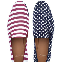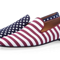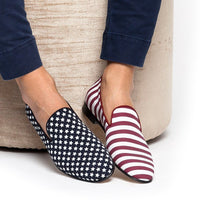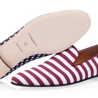 USA flag-inspired canvas slippers. Handcrafted in Vigevano, Italy, according to the traditional “a sacchetto” technique with calfskin lining and leather soles.
