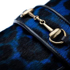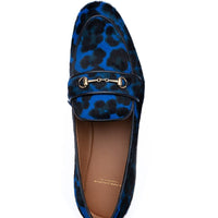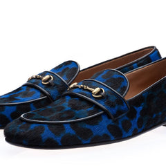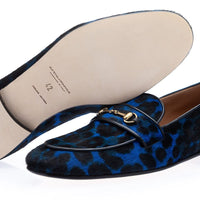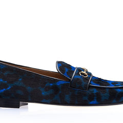Blue toned animalier-printed superior calfhair slippers with black clafskin piping and metal horsebits in antique gold finishing.