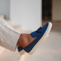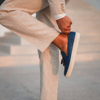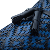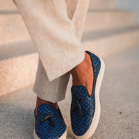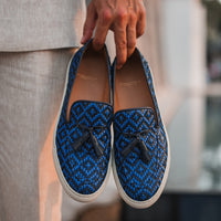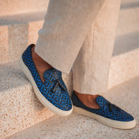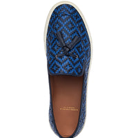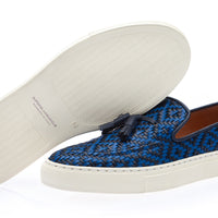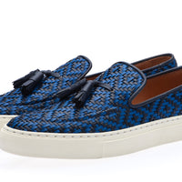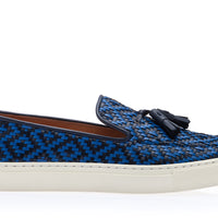 Navy blue and bluette hand-loomed calfskin slip-on sneakers with matching tassels.