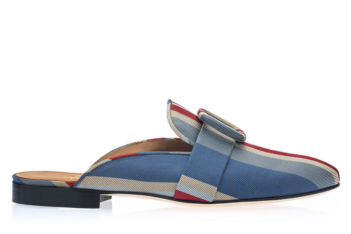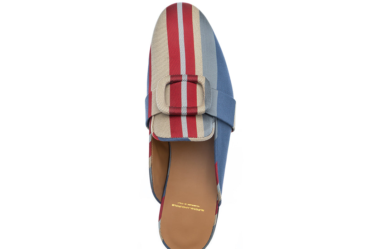 A refined expression of relaxed elegance, these multicolor striped canvas mules bring vibrant character and effortless sophistication to contemporary summer dressing. The upper features a dynamic striped pattern combining deep red, blue, light blue, beige, and subtle white accents, creating a harmonious interplay of color that feels both classic and modern. The bold striped composition is enhanced by matching bands across the vamp, finished with oversized fabric-covered buckles and refined piping that frame the silhouette with tailored precision.