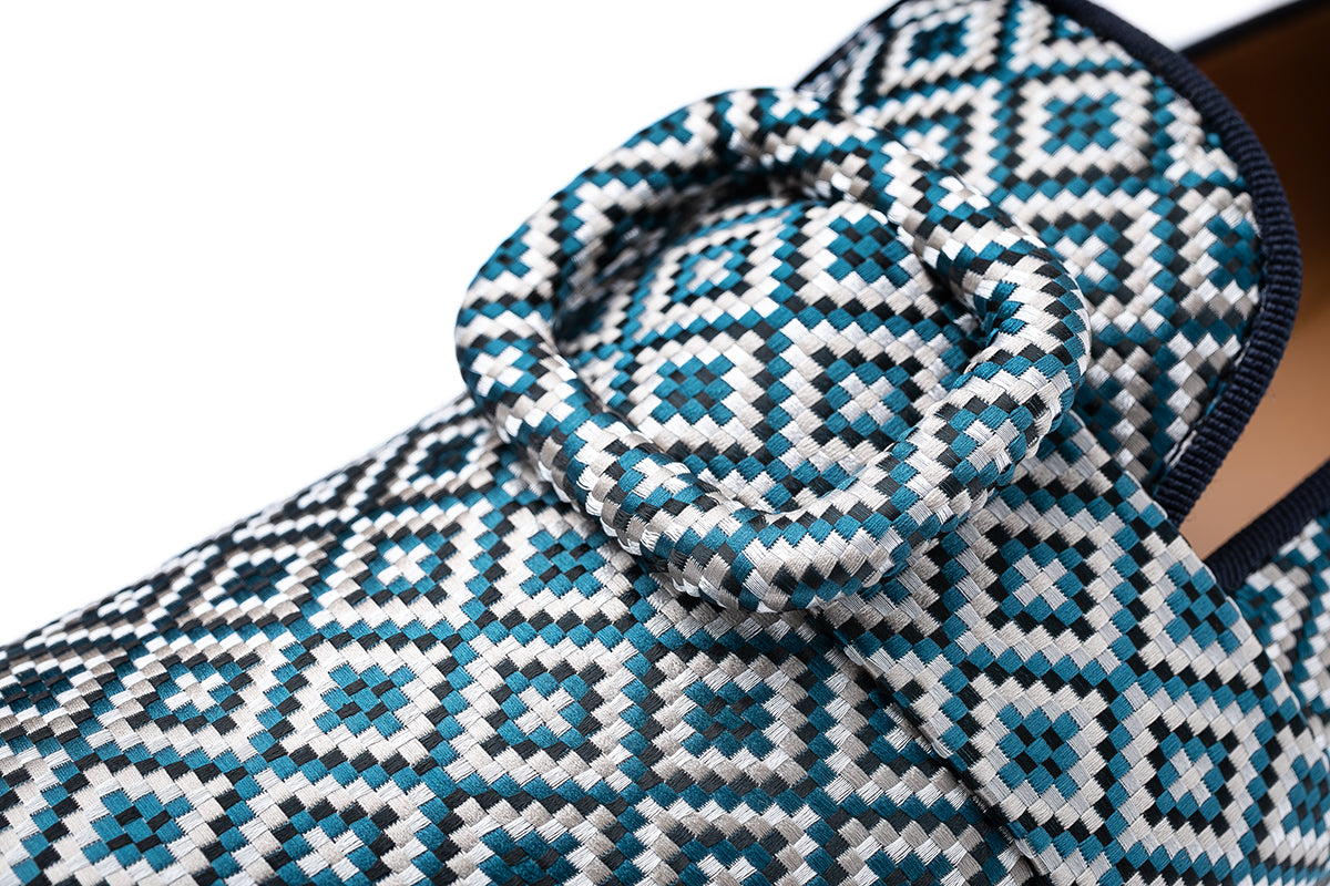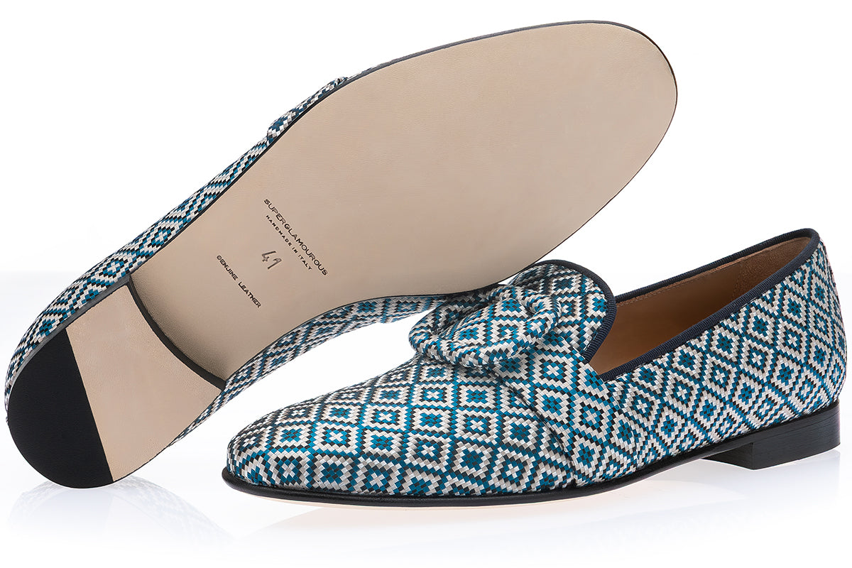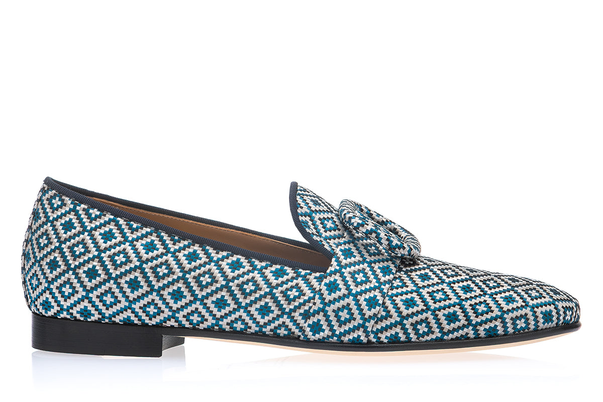 Elevate your formal attire with our blue-toned jacquard canvas slippers, a refined expression of craftsmanship and understated sophistication. Featuring matching jacquard bands and oversized buckles fully wrapped in the same intricately woven fabric, these slippers offer a textured and distinctive aesthetic, ideal for elegant yet contemporary occasions.