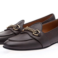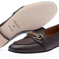 Dark brown calfskin Belgian loafers with matching piping and bands adorned with metal horsebits in antique brass finish. This style is handcrafted with a smooth and soft calfskin washed without using chrome and heavy metals for an exclusive waxed effect. Handcrafted in Vigevano, Italy, according to the traditional “a sacchetto” technique with calfskin lining and leather soles.