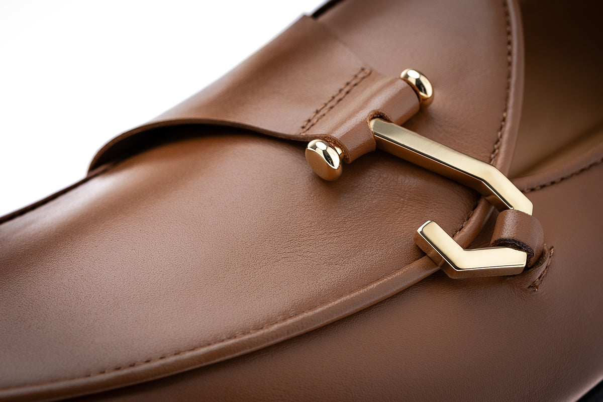 Warm and refined, our tobacco-colored Belgian loafers in supple Italian calfskin offer a luminous reinterpretation of the Tangerine 12 silhouette. Enhanced by a distinctive square metal hook in a polished gold finish, this single-monk design blends classic construction with a bold, contemporary accent.