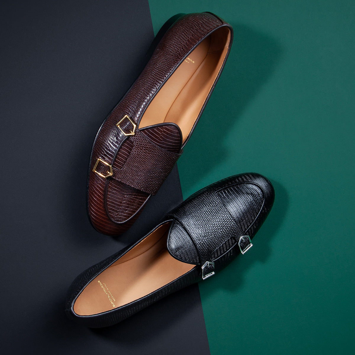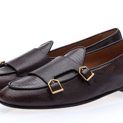 Handcrafted Dark Brown Tejus-Printed Calfskin Double-Monk Belgian Loafers with Gold Buckles