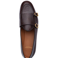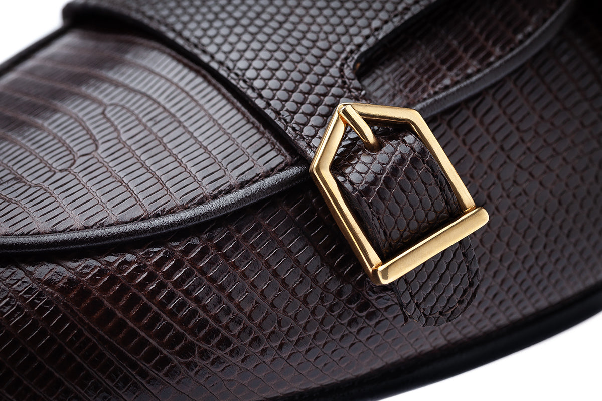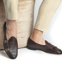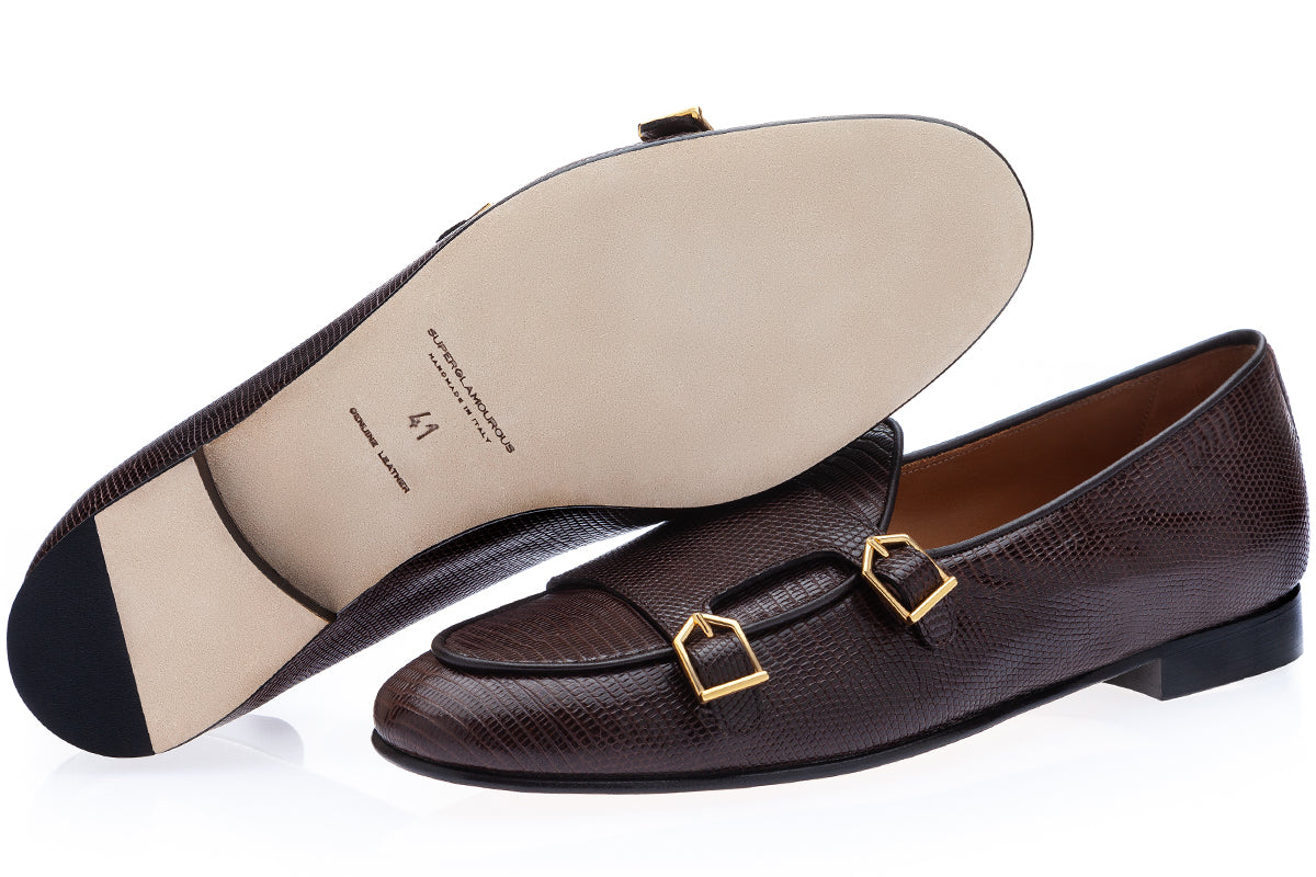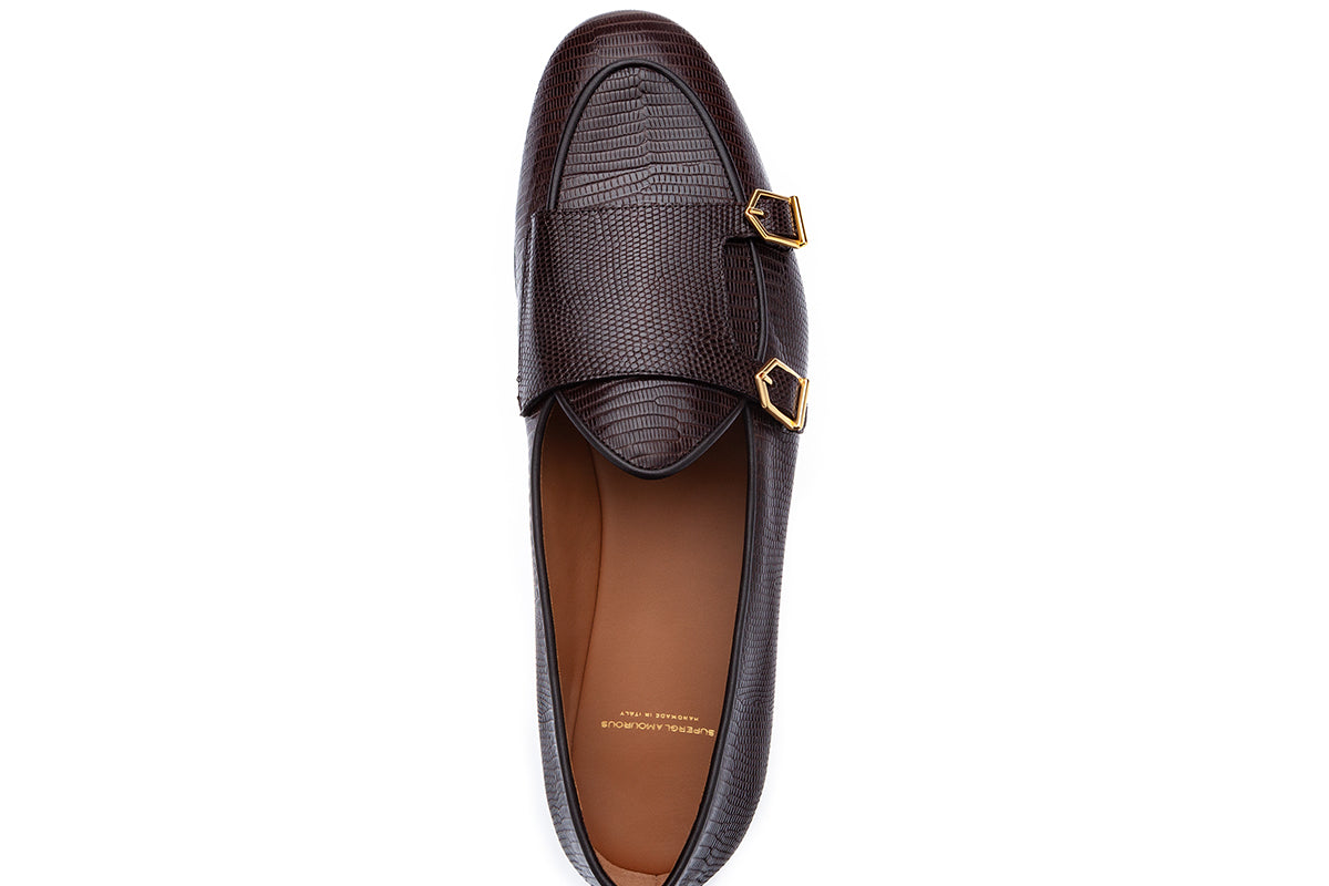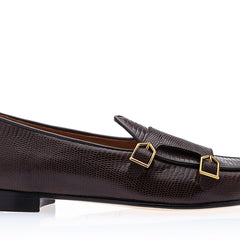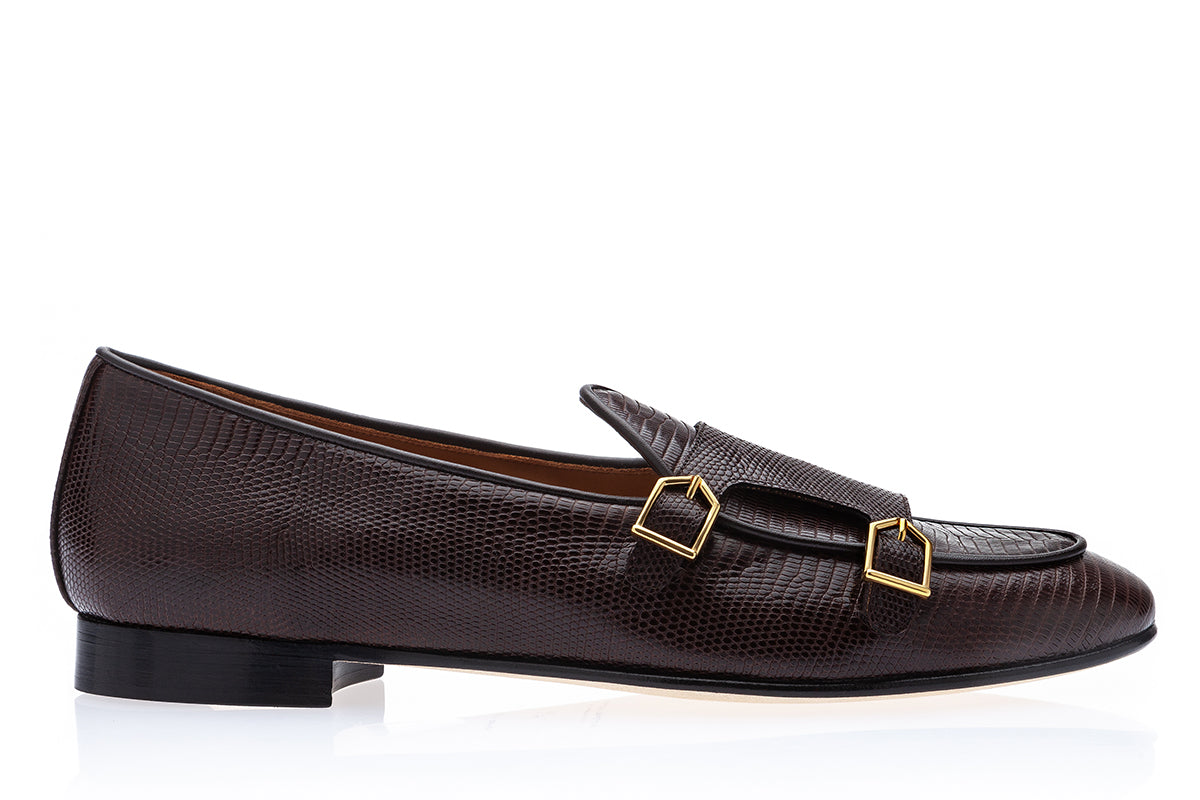 Step into timeless elegance with our dark brown tejus-printed calfskin double-monk Belgian loafers, a sophisticated reinterpretation of the brand's iconic Tangerine 7 style. Featuring matching piping and luxurious gold-finished metal buckles, these loafers offer a perfect blend of refinement and versatility. The textured tejus print adds depth and richness, while the warm dark brown tones and golden accents create a look of understated luxury.