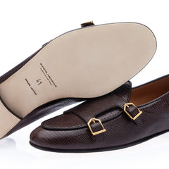 Refined and versatile, these dark brown double-monk loafers with gold accents are a testament to Italian artistry, offering timeless sophistication for any occasion.