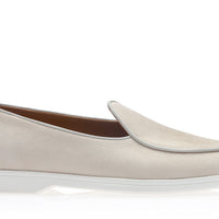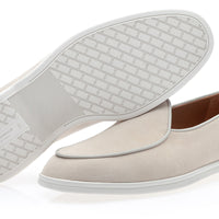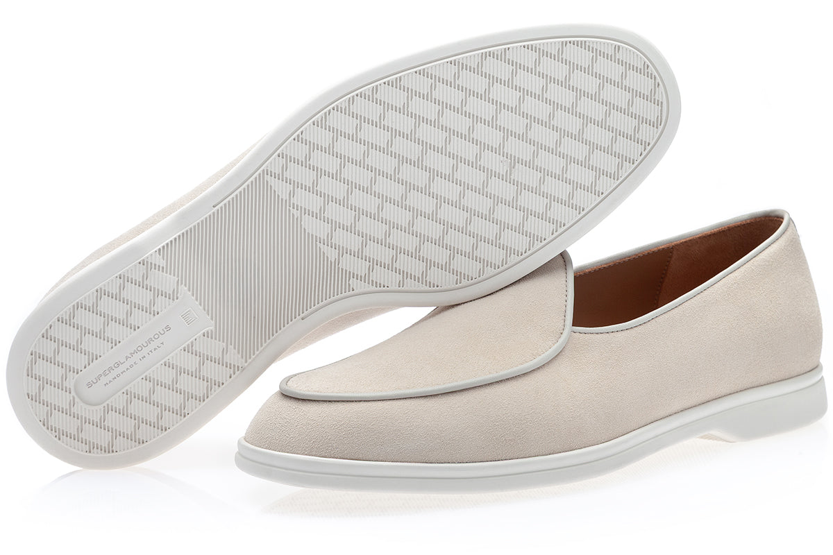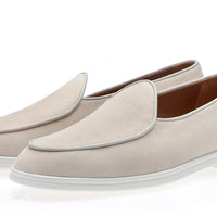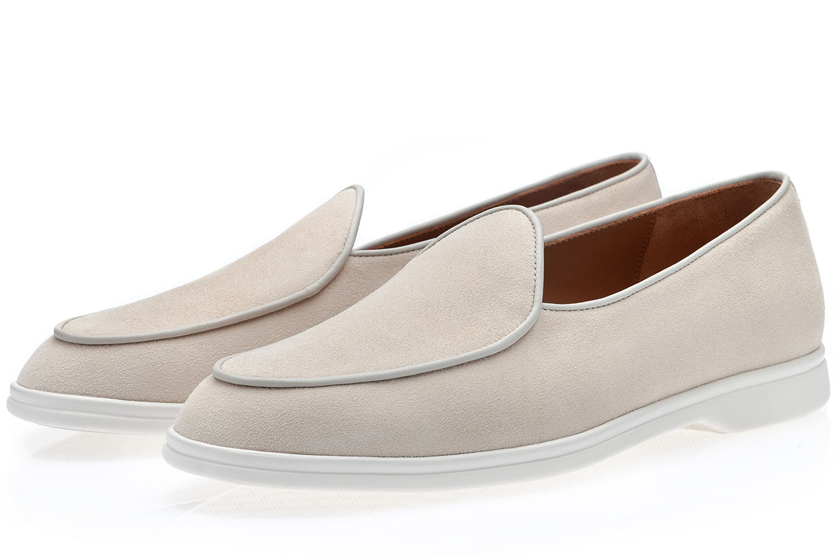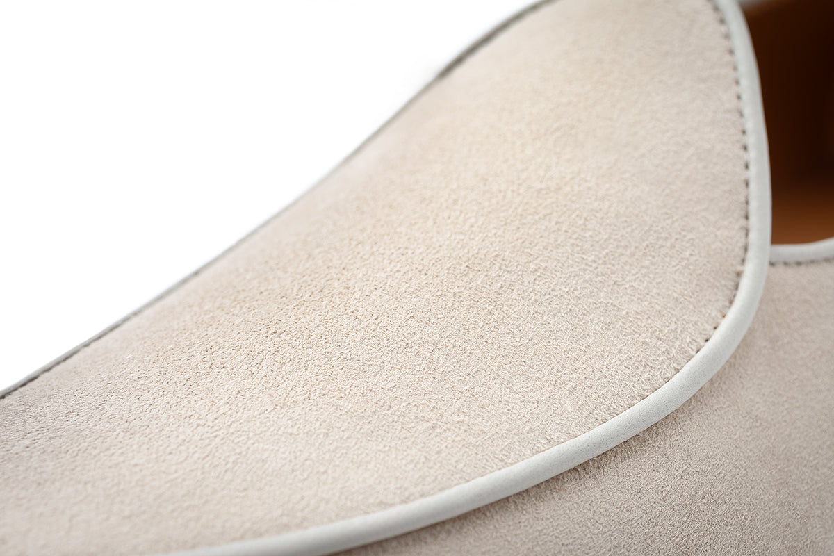 Handcrafted Beige Suede Belgian-Style Slip-On with Calfskin Piping and Seamless Margom® Soles